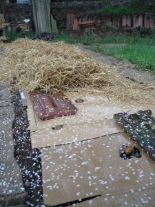 Si plou els dies abans de la collita, sí que us podeu trobar que la palla quedi humida i enfangada i, per tant, que les patates no surtin directament tan netes. Igualment, en aquest cas, haureu d’accelerar una mica la collita per tal d’evitar que es desenvolupin massa cargols o llimacs – cosa que la palla, com qualsevol encoixinament, pot tenir l’inconvenient d’afavorir.