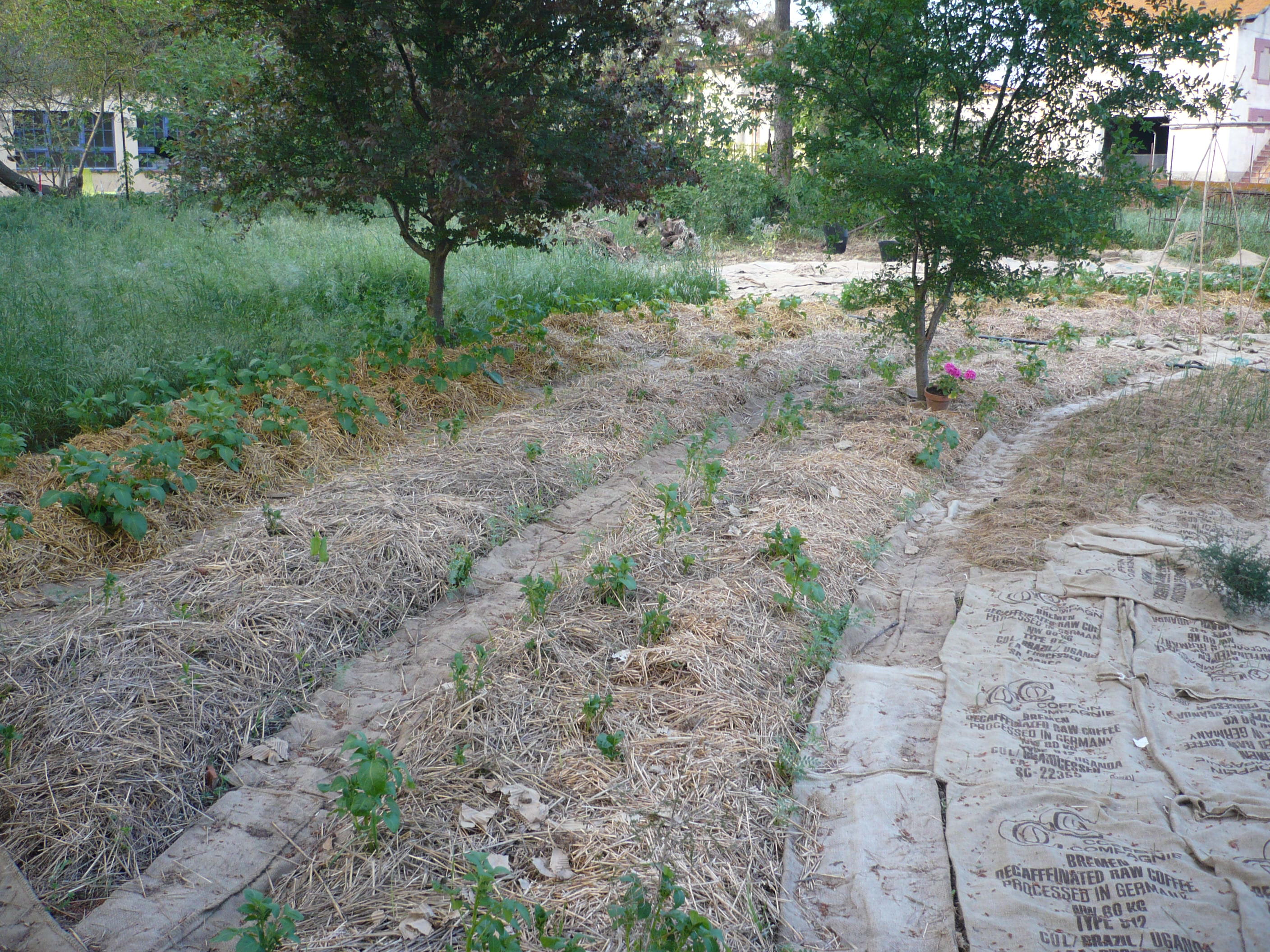 A les publicacions sobre Permacultura, havíem llegit més d’una vegada informació sobre un mètode alternatiu de conrear patates. Ens semblava realment interessant ja que no requeria remenar terra ni una sola vegada: ni per sembrar, ni per calçar, ni per collir. I no remoure la terra és doblement bo, perquè per una banda s’estalvia molta feina (i mals d’esquena) i per altra banda no es destorba l’estructura del sòl ni els seus habitants.