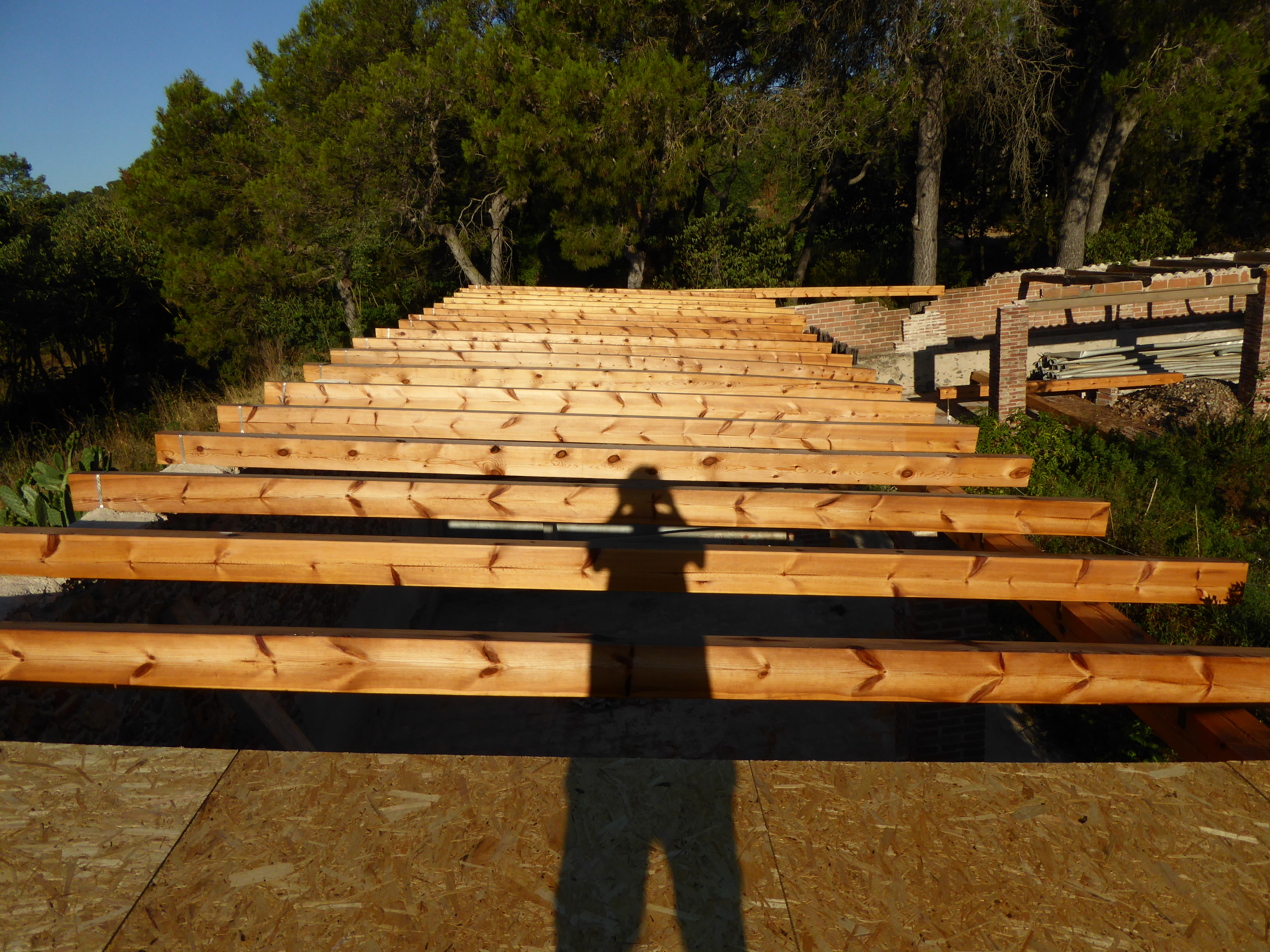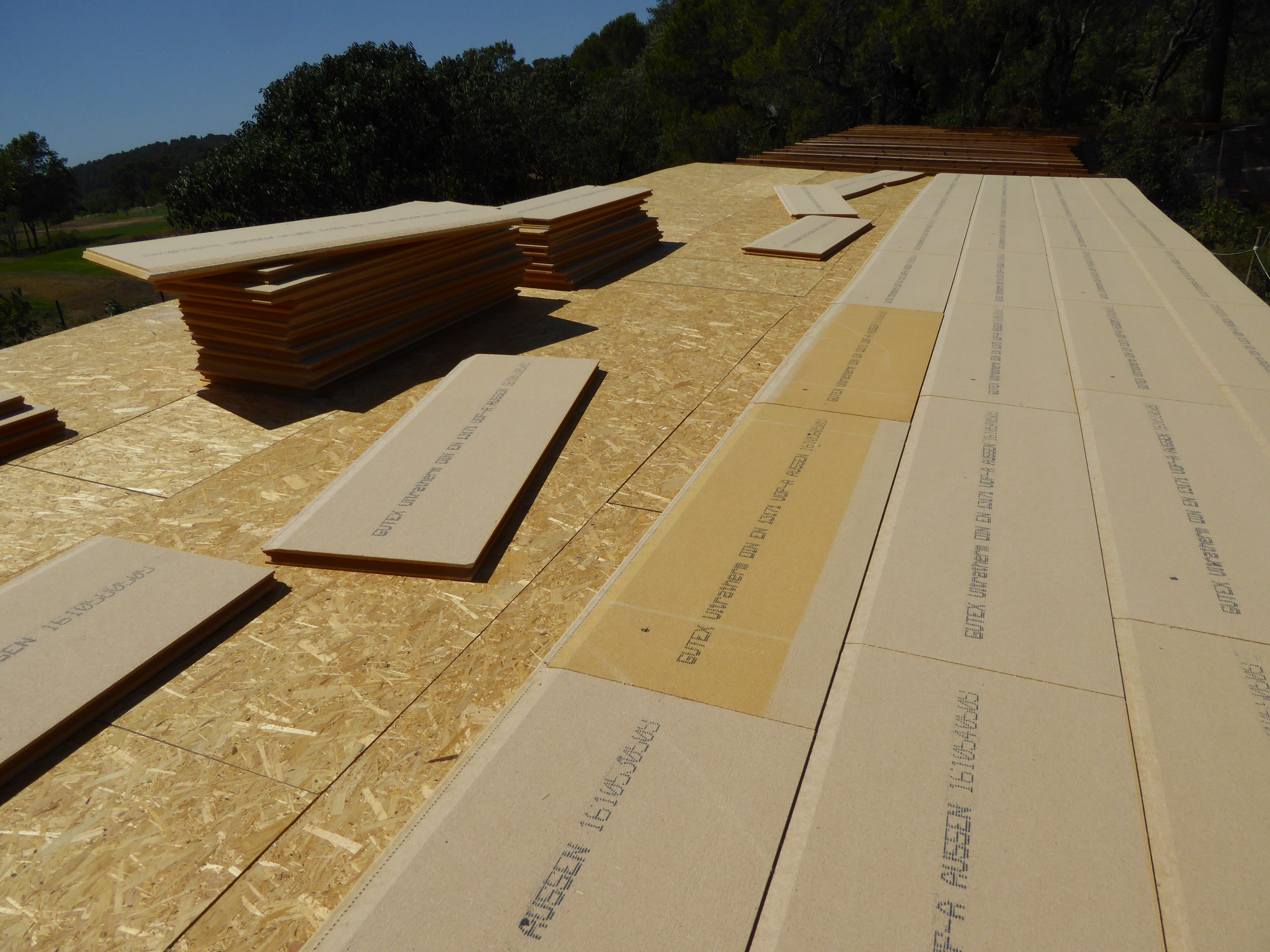 Només un dia després d’acabar de posar l’OSB, ja tenim la capa aïllant (plaques de fusta premsada) instal·lada com una mena de puzzle gegant:
