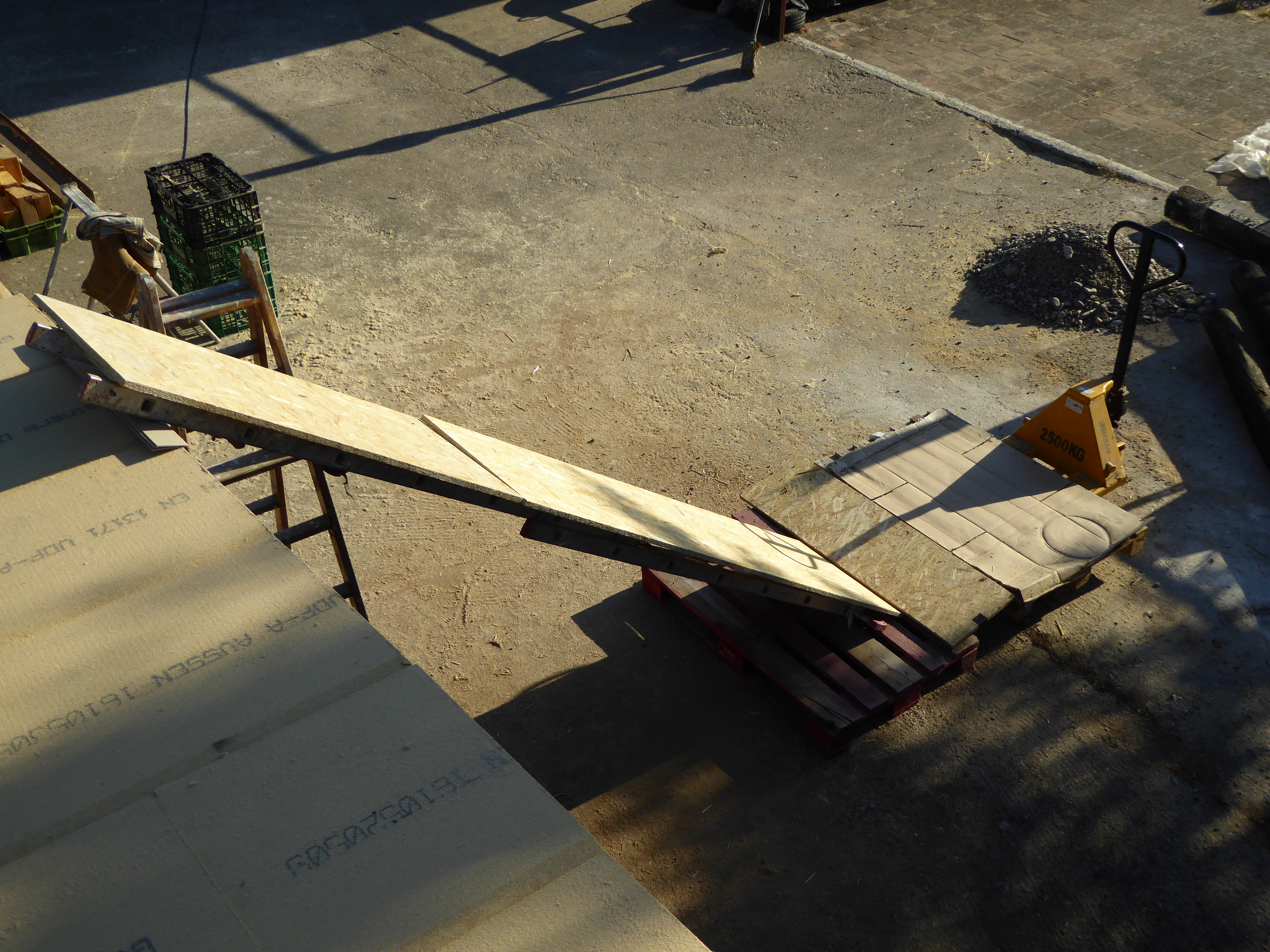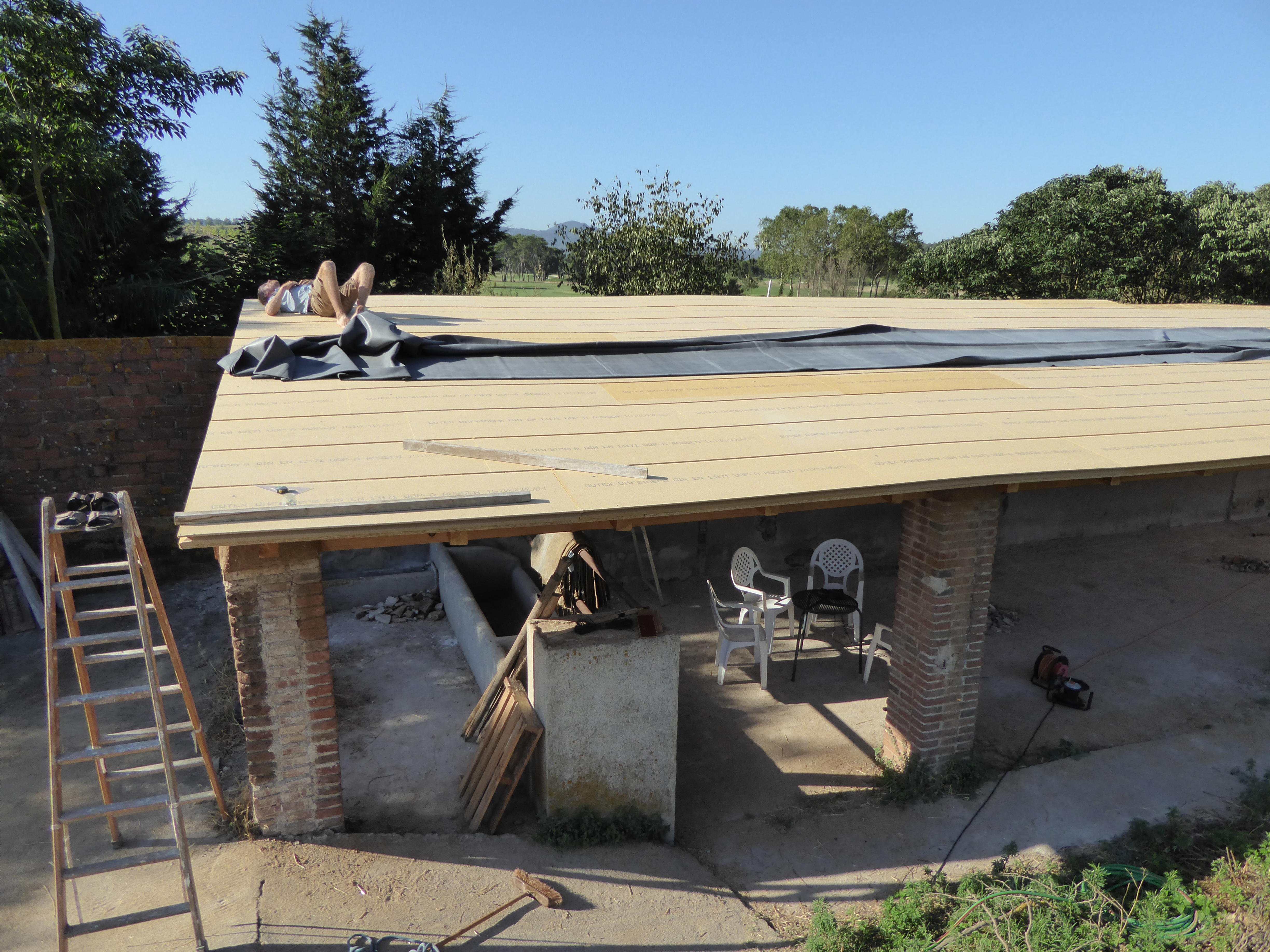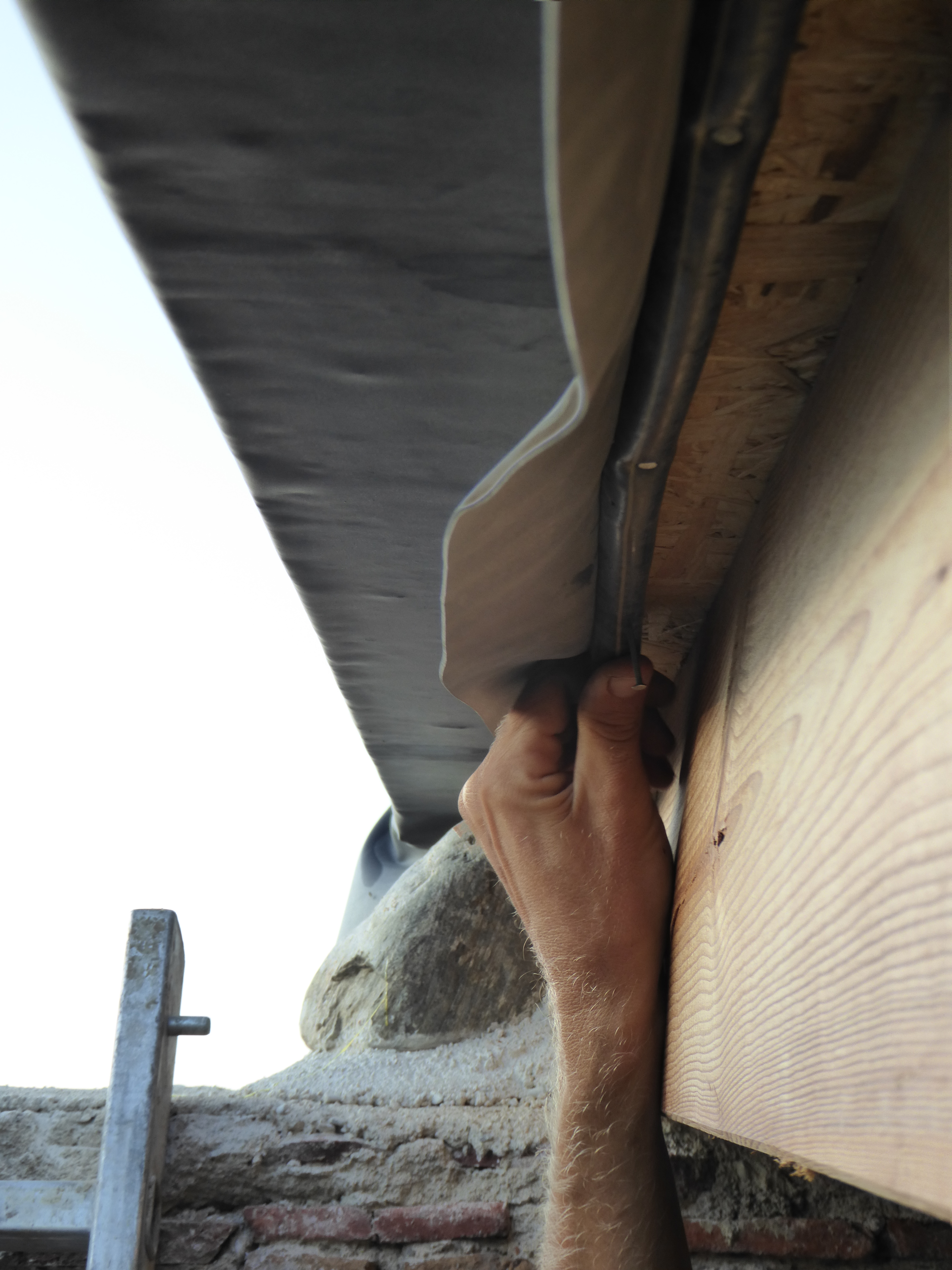 Falta la membrana impermeable per protegir-ho tot, però essent una sola peça que pesa uns 150kg, s’ha de fer un invent per pujar-la a dalt – vet aquí la solució: