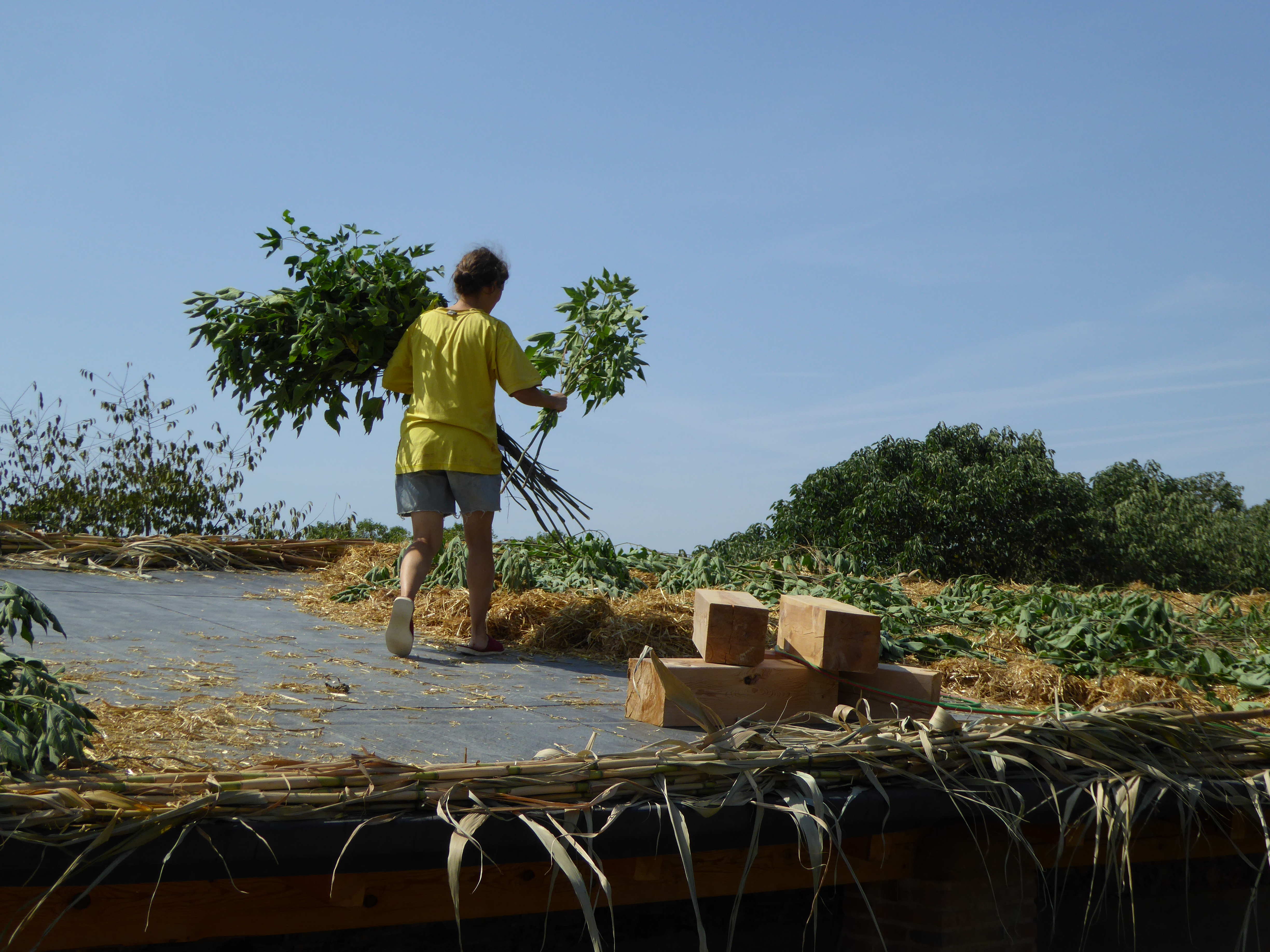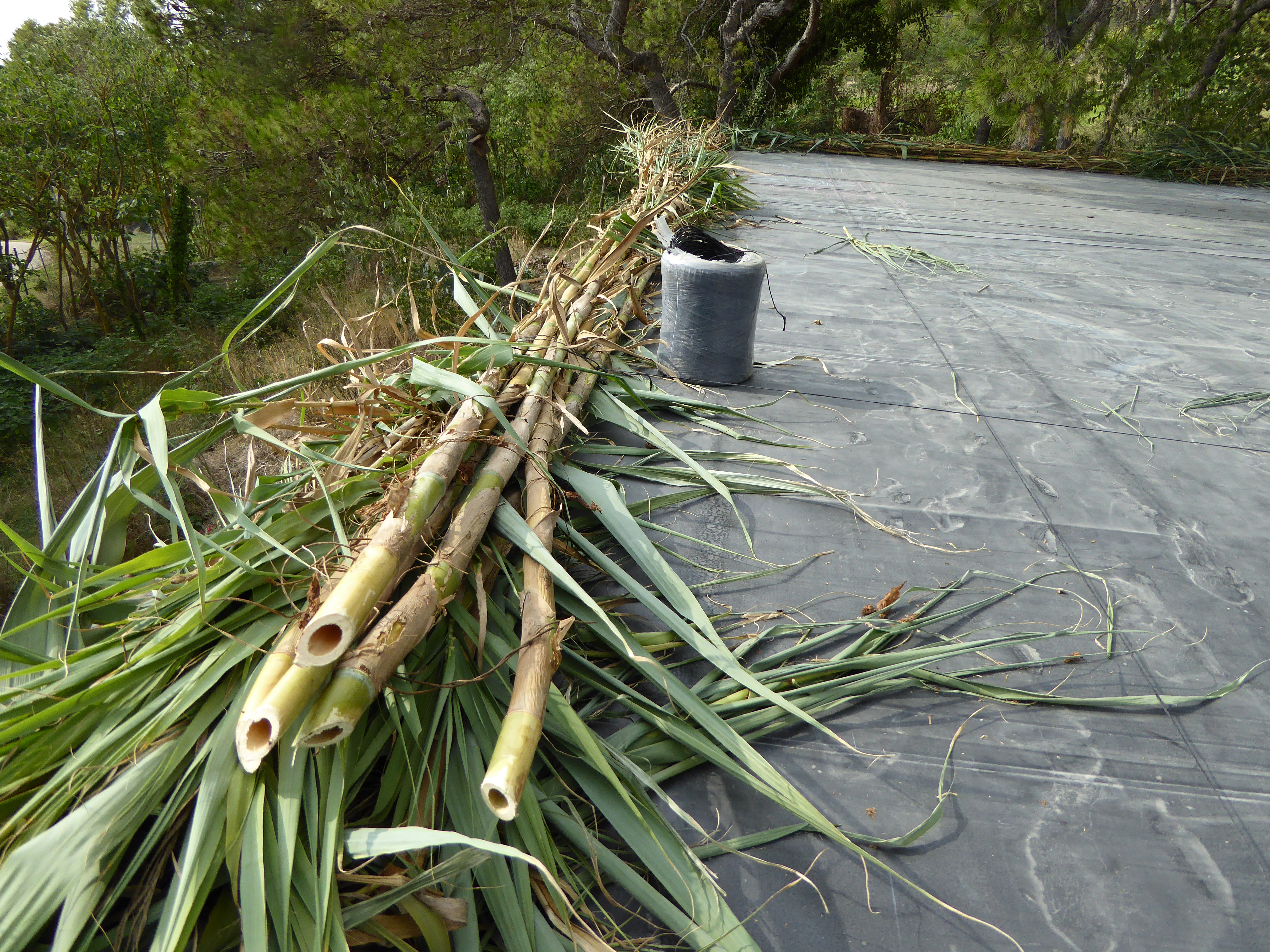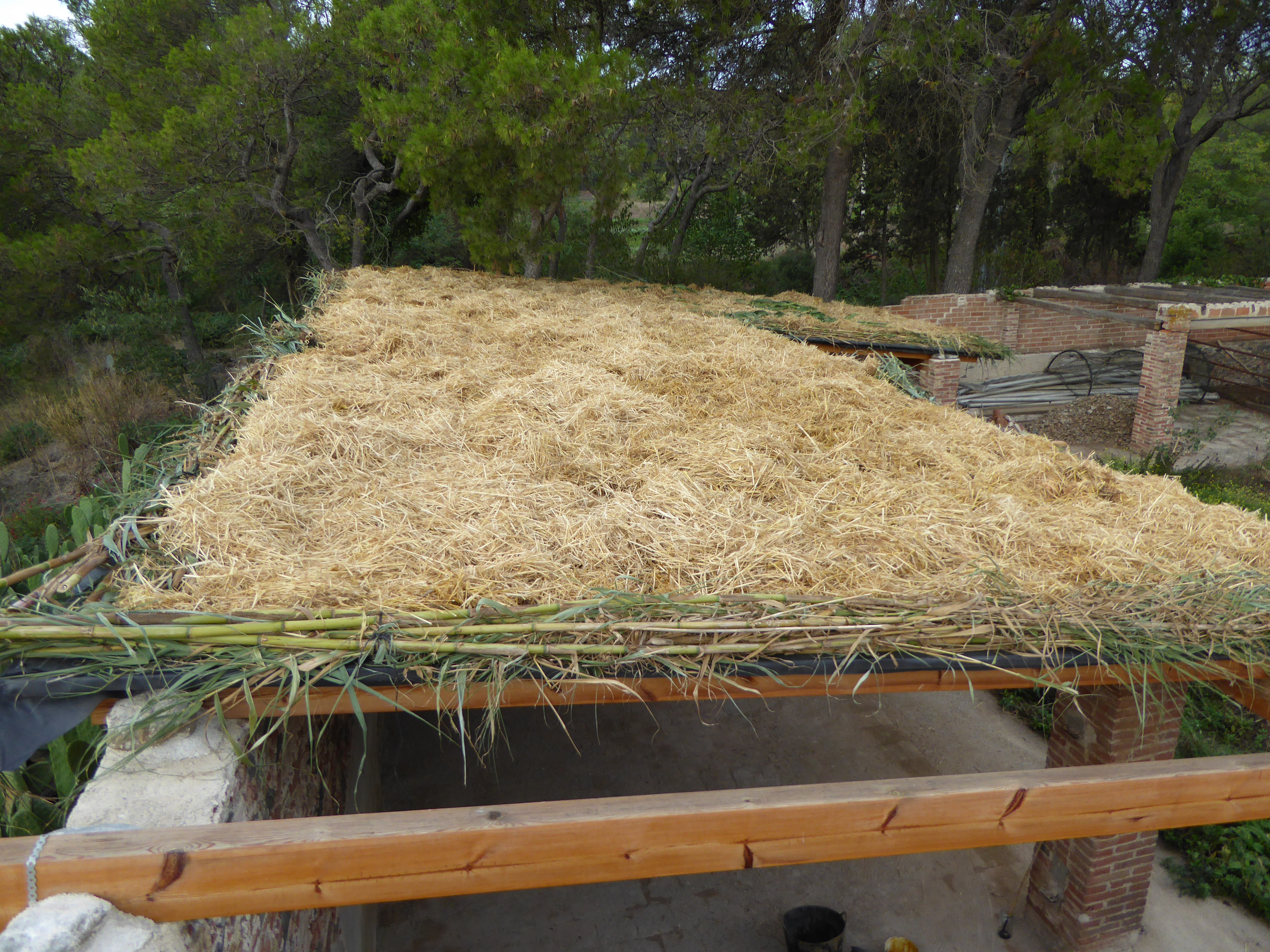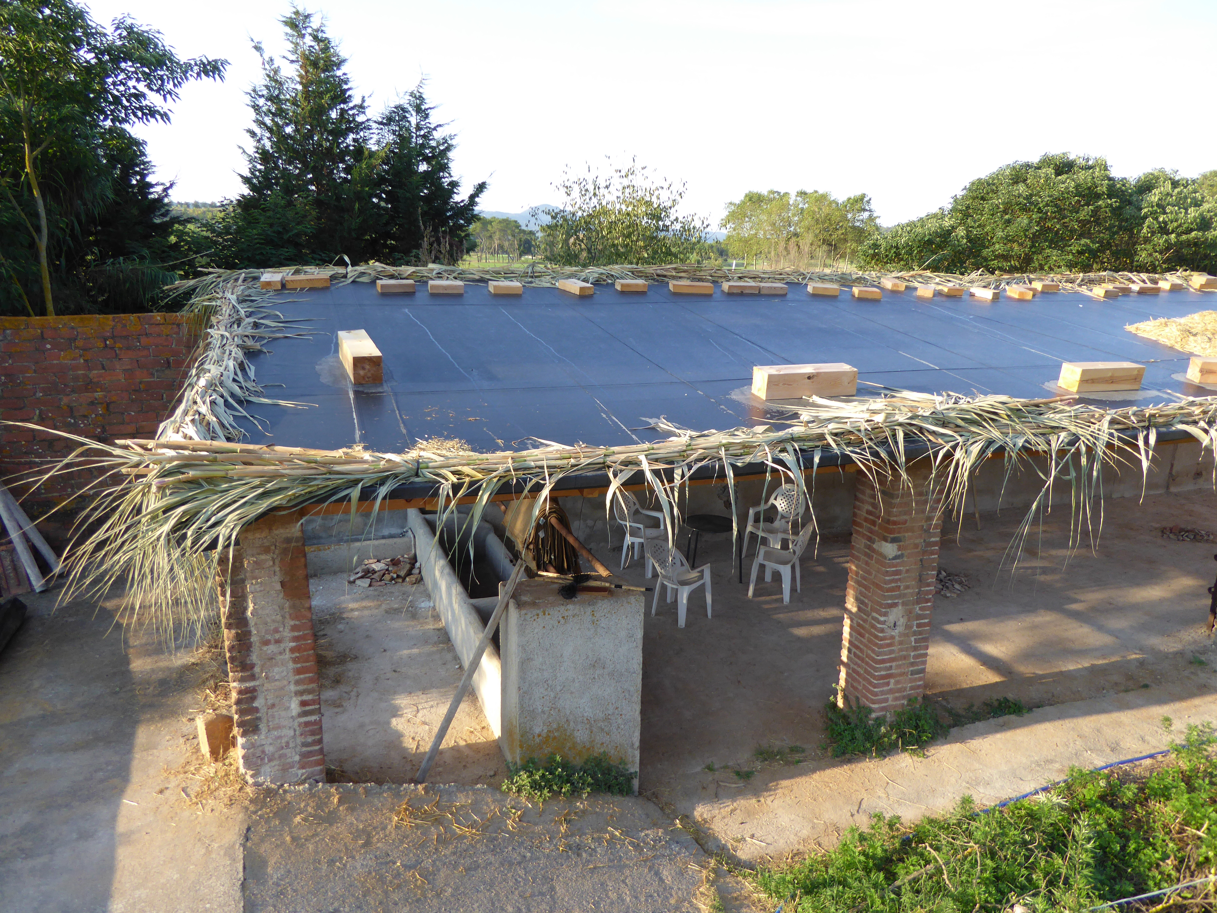 Després d’uns quants debats, per retenir la palla, optem pel recurs més local – canyes de riu a 20m de l’obra. Se’n fan feixos, i es posen tot seguint el perímetre de la teulada, lligades entre si, i també a alguns punts de les bigues de dalt:
