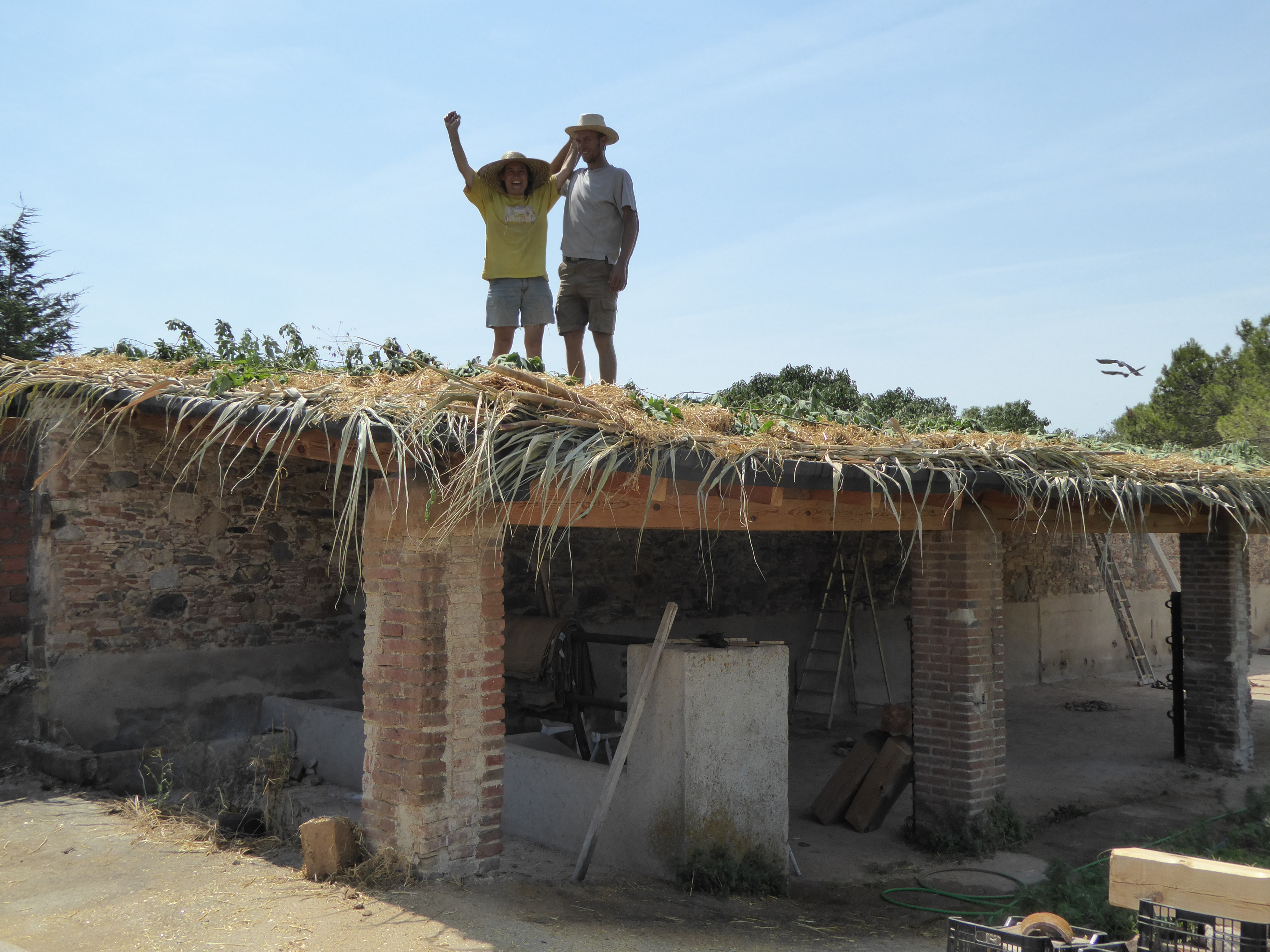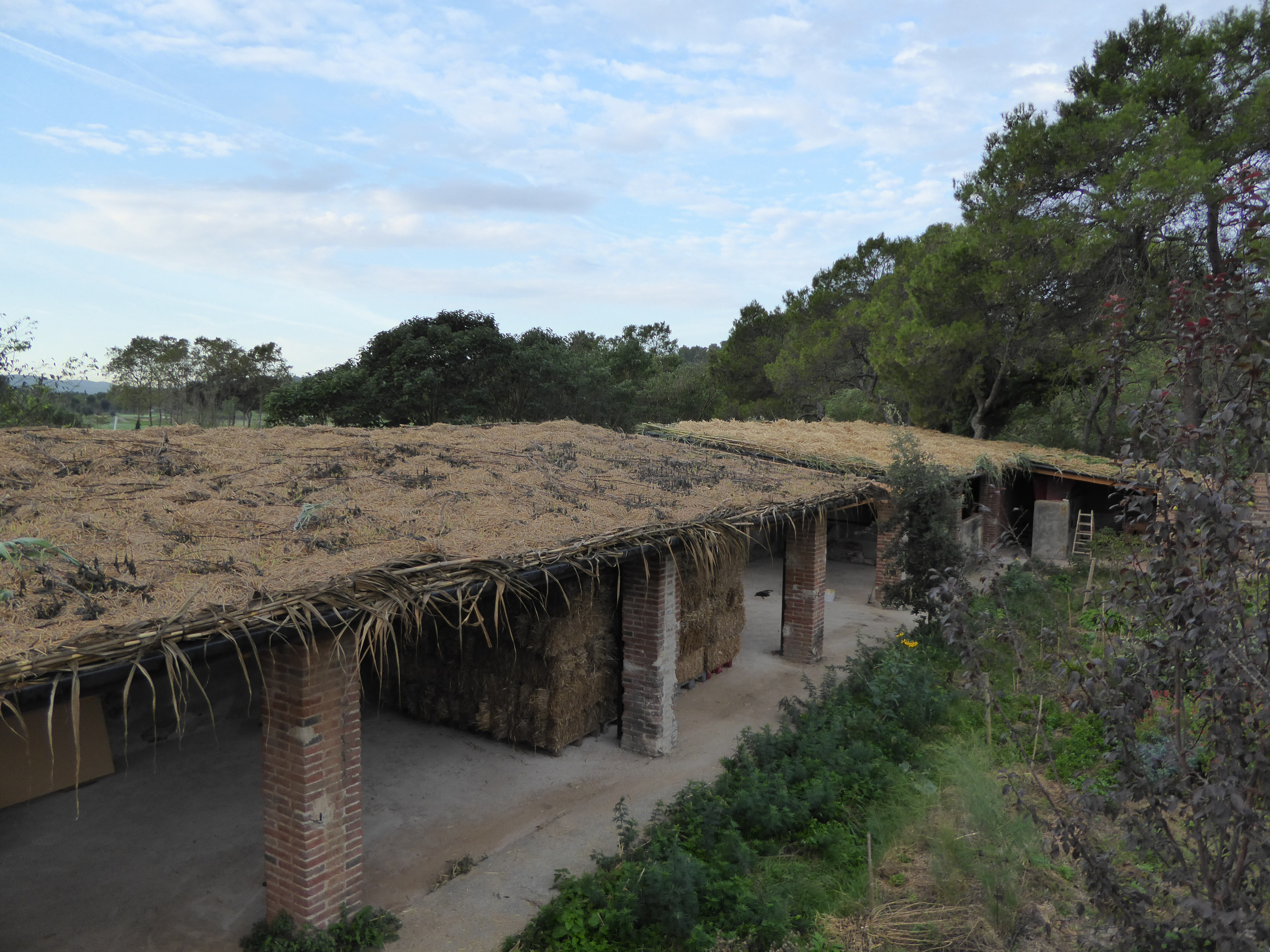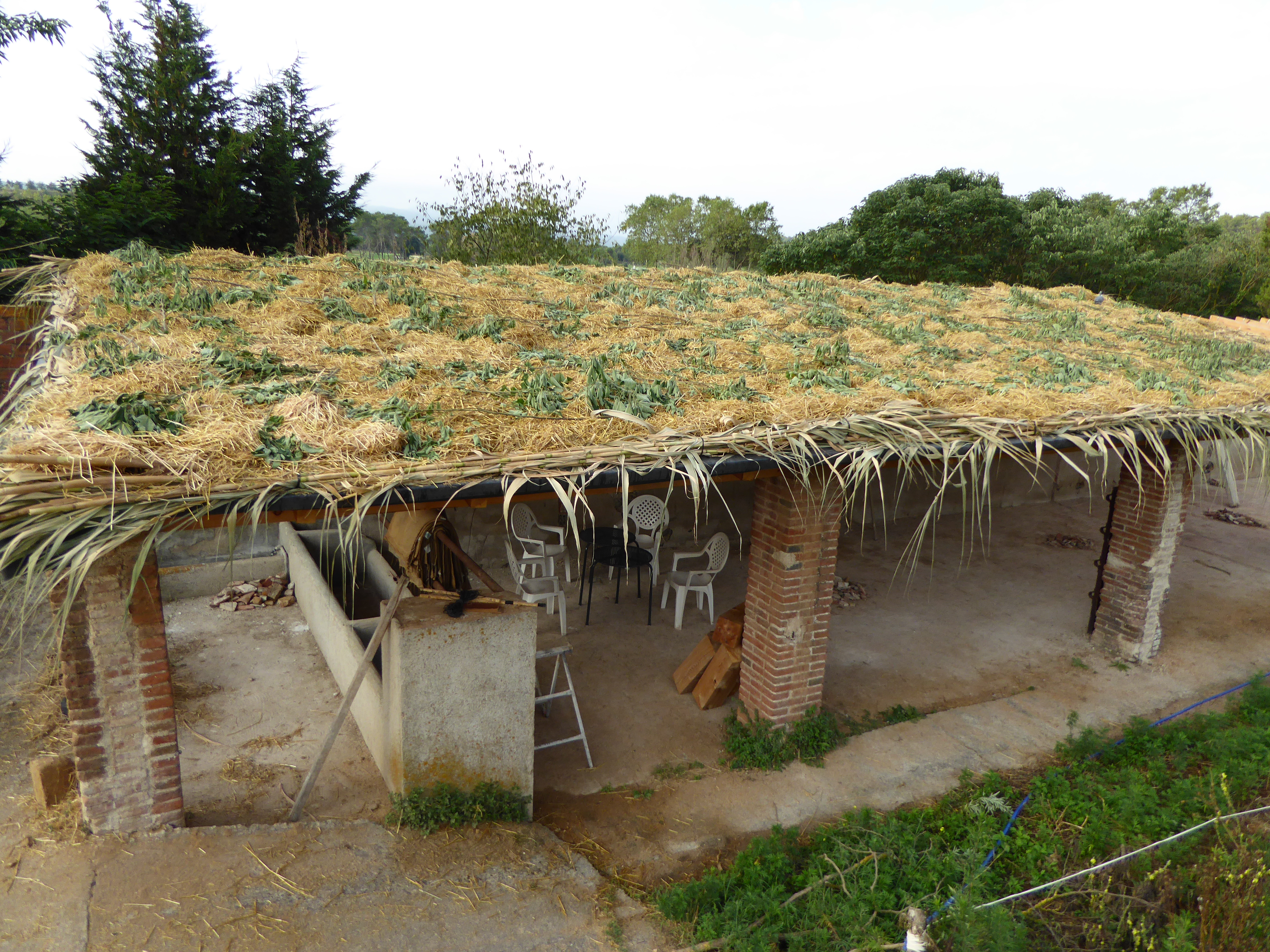 Amb el temps d’escriure aquest petit resum, hem aconseguit fer ja la segona meitat, i, per tant, ja ho tenim tot cobert (el petit tram obert de l’esquerra amb una biga a la vista serveix com a petit pati i entrada de llum; a la foto de la dreta es veuen les bales de palla destinades a les parets a sota el cobert):