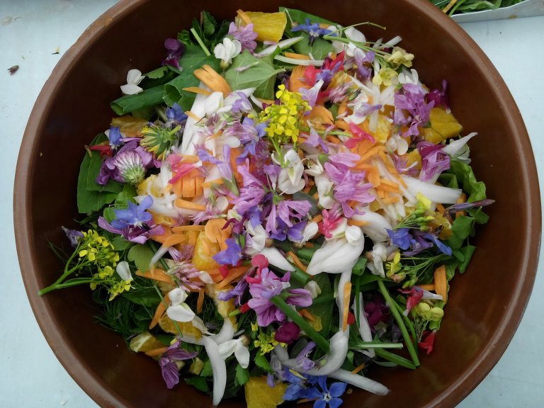 A la primavera el verger (o bosc d’aliments) ens proveeix d’una varietat fantàstica d’ingredients per a l’amanida. Però ni tan sols nosaltres ens pensàvem que poguéssim reunir tantes espècies en una sola collita. Darrerament hem fet un parell d’amanides per a compartir amb amics i ho hem comptat: 40 com a mínim!