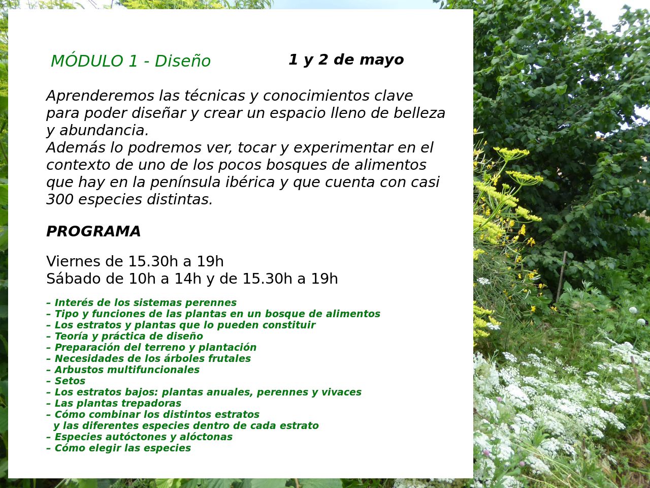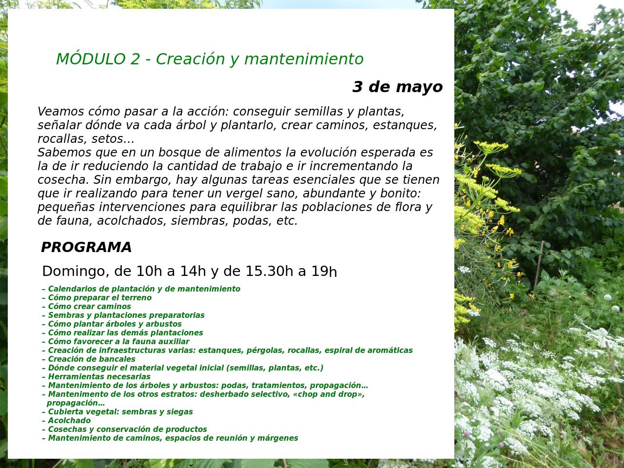Este curso pretende dotaros de las estrategias y conocimientos concretos y prácticos par poder crear y gestionar vuestro bosque de alimentos, des de su diseño y plantación hasta su mantenimiento regular.