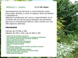 Aprenderemos las tácnicas y conocimientos clave para poder diseñar y crear un espacio lleno de belleza y abundancia. Además lo podremos ver, tocar y experimentar en el contexto de uno de los pocos bosques de alimentos que hay en la península ibérica y que cuenta con casi 300 especies distintas.